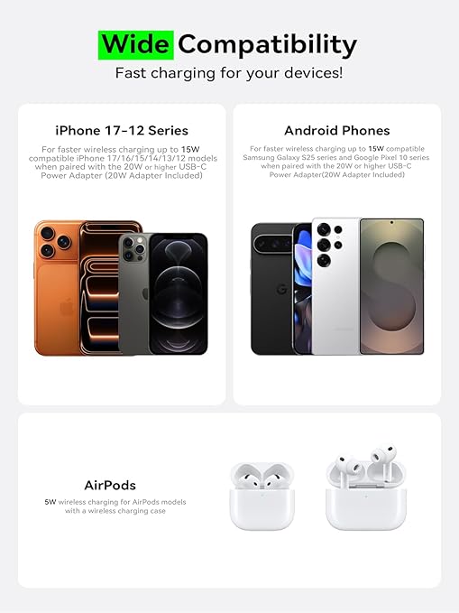 Charge your devices effortlessly with this Wireless Charger, designed for fast, safe, and convenient power delivery. Simply place your smartphone or compatible device on the sleek, compact charging pad—no cables required. With overcharge protection and stable charging performance, it keeps your devices powered efficiently while maintaining safety. Perfect for home, office, or travel, this wireless charger combines functionality with a minimalist design for a clutter-free charging experience.